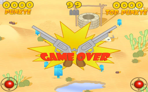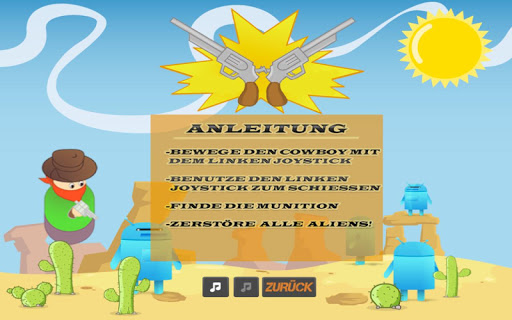 Mit dem linken Joystick bewegen Sie den Cowboy und versuchen den Aliens auszuweichen und in eine gute Schussposition zu kommen. Der rechte Joystick feuert die Waffe ab.