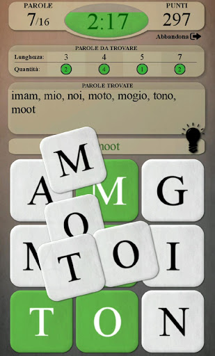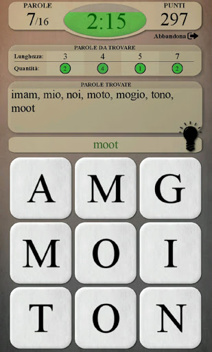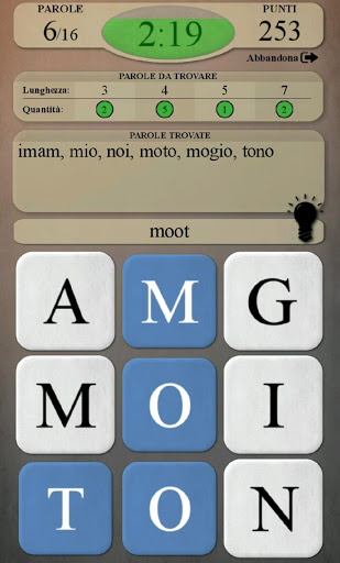 - Suggerimento: compare una lampadina ogni 20 secondi. Se la tocchi, ti saranno rivelate le prime due lettere di una parola (non ancora trovata) (in azzurro - la prima lettera, in blu - la seconda)