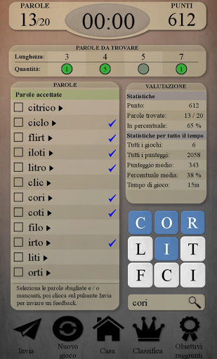 - Schermo di valutazione: statistiche, parole disponibili e animazioni su come trovarle, link rapido alle entrate del dizionario per le parole sconosciute