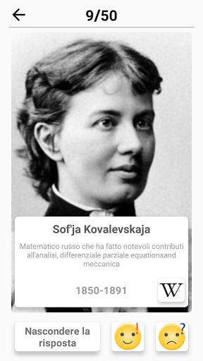 • Flashcard: un collegamento alla biografia completa di ogni persona nell'enciclopedia e una breve informazione biografica. Puoi regolare i tuoi studi contrassegnando le donne famose eccezionali che già conosci per evitare ulteriori ripetizioni e evidenziando quelle che vorresti rivedere.
