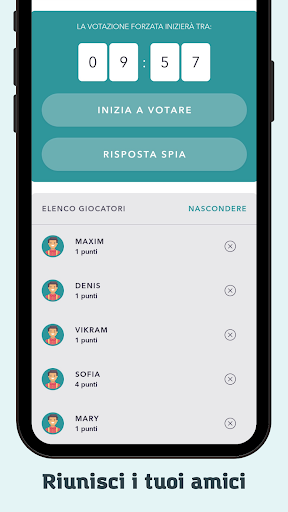 Gioco per una compagnia di 3 o più giocatori. Gioca a una festa con amici o persone care, hai solo bisogno di pochi giocatori e dell'app Spy per divertirti insieme.