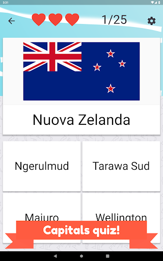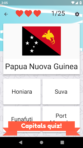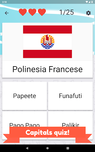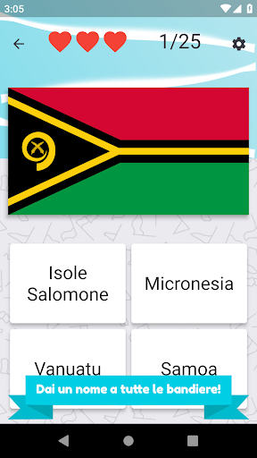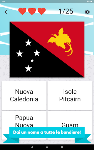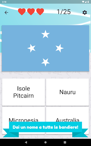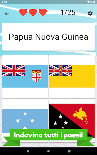 Chiama tutti i paesi dell'Oceania e seleziona la bandiera corretta. Ci sono 25 diversi paesi e bandiere dell'isola da indovinare.