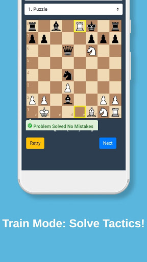 In Train mode, the player tries to solve checkmate problems and Receives feedback based on whether he is doing it right or wrong. If he wishes, he can move on to new tactics or try to solve the same puzzle again With this mate trainer.