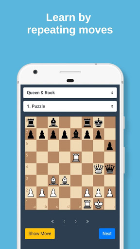 This chess app includes two modes, Train and Learn. In Learn mode, the correct move is shown to the user and the user is expected to make the move. The user then repeats the move once again.