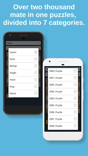 The chess mate in 1 trainer, is divided into seven categories. These categories are; Queen, Rook, Bishop, Knight, Pawn, King and Mixed. These categories represent which stone will make the mat in one move. In the Mixed category, all chess pieces are given mixed.