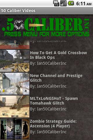 Stay up to date with the latest and greatest video game videos This app is an automatically updating collection of videos made by the 50 Caliber Inc Team. From strategies for Call of Duty: Black Ops Zombies to videos where we play videos games blindfolded; this app has all the videos you will ever need.Includes Videos From These Games:Call of Duty: Black OpsCall of Duty: Modern Warfare 2Call of Duty: world at WarComing Soon:Battlefield 3Uncharted 3gears of war 3And much more