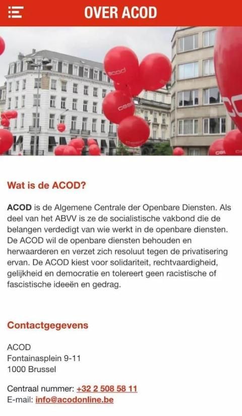 ACOD is een informatieplatform dat onze vakbondscommunicatie verenigt. Een groot deel van de info die je vandaag zoekt op ACOD Online, Facebook, Twitter en op de vele websites van gewesten en sectoren bundelt de ACOD-app. Uiteraard zal je deze informatie ook kunnen delen met andere en toekomstige vakbondsleden. En niet onbelangrijk, via deze app kan je ook video’s en foto’s van acties en evenementen bekijken en contact opnemen met de ACOD.