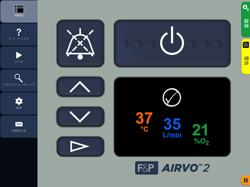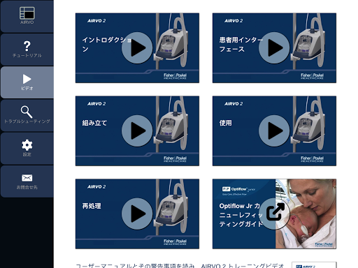 設定や酸素濃度を変更し、アラームを再現することができます。AIRVO 2 の基本操作を習得するためのチュートリアル、操作手順の動画がご利用いただけます。