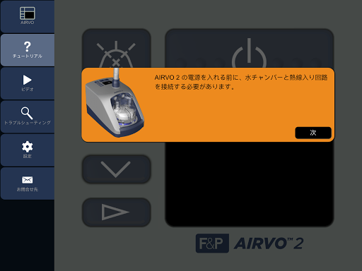 注意: このアプリは、AIRVO 2 およびmyAIRVO 2 の操作方法のトレーニング用です。実際にはAIRVO 2 またはmyAIRVO 2 本体を操作するものではありません。