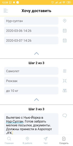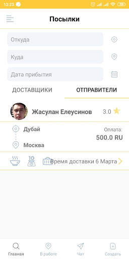 Не можете найти путешественника (Доставщика) моментально? .. не стоит беспокоиться! Создаете объявление на отправку посылки с указанием маршрута, даты, фото и физических характеристик посылки, цены за услугу и прочих пожелании, чтобы Доставщики связывались с вами, откликаясь на ваше объявление! Нет необходимости искать время от времени.