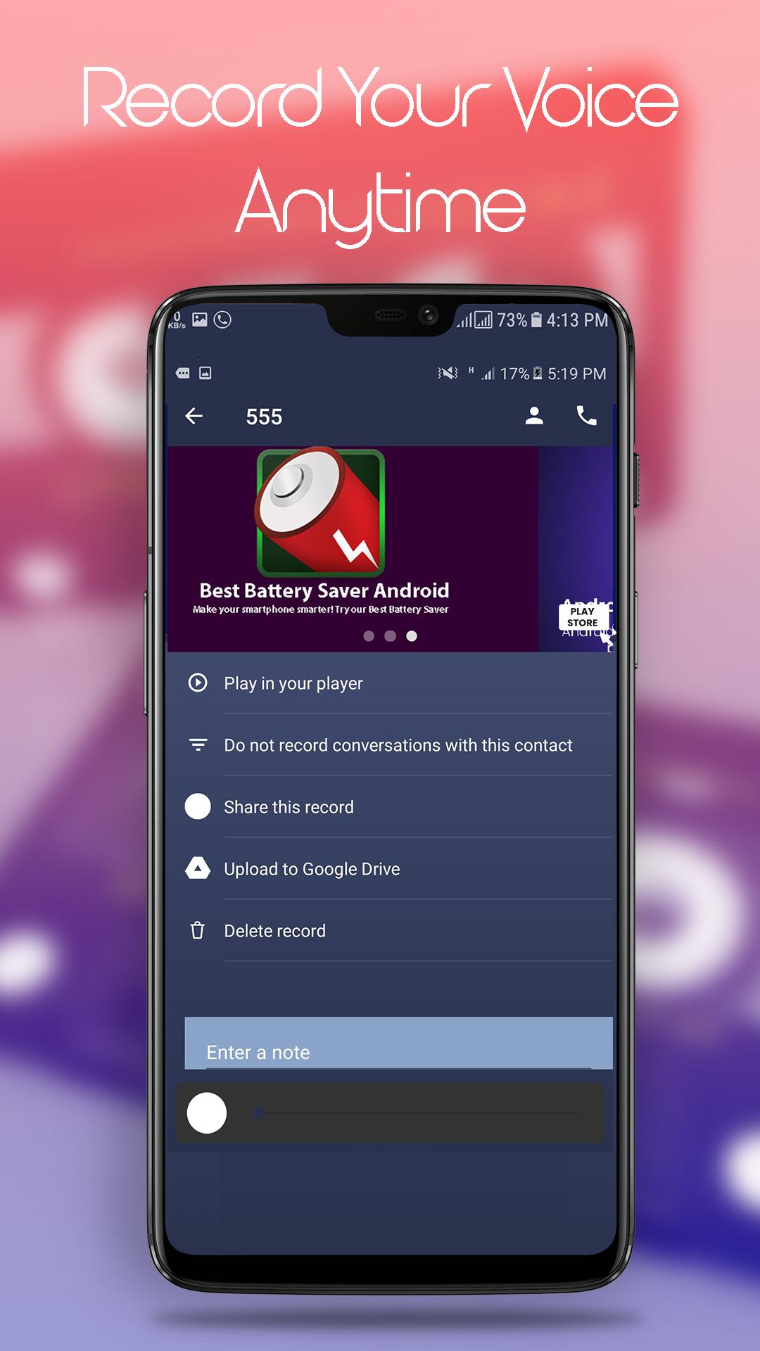 One of the most important features of this automatic call recording app is that it gives you the freedom to save recorded file on Google drive/dropbox, so you don't have to delete these files to clean your phone's memory after few days.