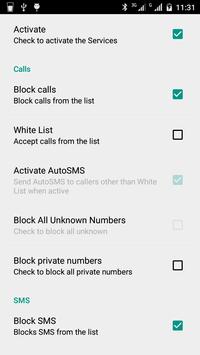 Feature List Black List –Block unwanted calls (Reject calls) –Block spam SMS (Simply block black list) -Select whether to block both SMS and Calls or block one of them. Block all Unknown calls. -you can block all calls that are not in your contact list. -Block private numbers White List -Block all incoming number except the numbers listed in Whitelist