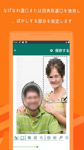 ✔のバーの次の画面には、2つのオプションが表示されます。最初のオプションは投げ縄選択/鉛筆のぼかし、もう1つは長方形のぼかしです。 鉛筆のぼかし/なげなわ選択を使用し、手でぼかし部分を指定し、それ以外の場合は調整可能な四角形部分を使用できます。 ぼかしる部分を選択した後、右上隅の保存ボタンを押し、プロセスが完了するまでを待ちます。