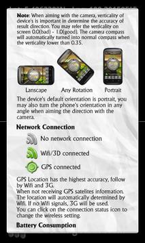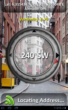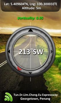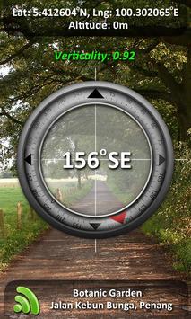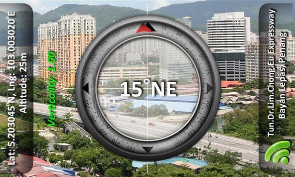 Camera compass is very useful in some situation especially when lower your head to see the compass is difficult and inconvenient to you. For example, when you are driving, riding, hiking, sailing, mountain climbing, jungle expedition, etc. There are an indicator on the compass view to indicates the verticality/tilt angle of the device.
