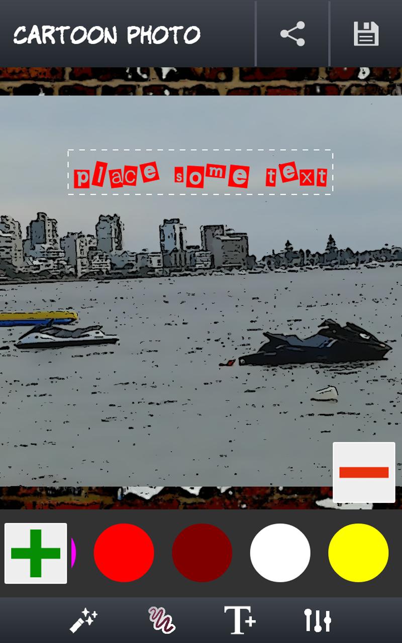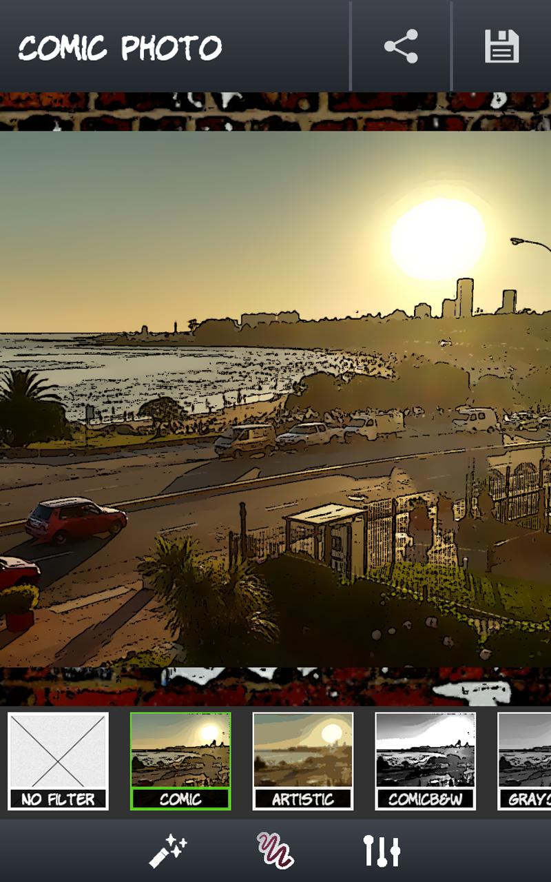 After editing the image, the last step is saving or sharing it. It can be done by a single click. Locate the save or share buttons in the action bar and tap them. Saving it will create a special folder for "Cartoon Photo" edited images. If you decide to share it, available options include: Facebook, Whatsapp, Instagram, Email, MMS and many more.