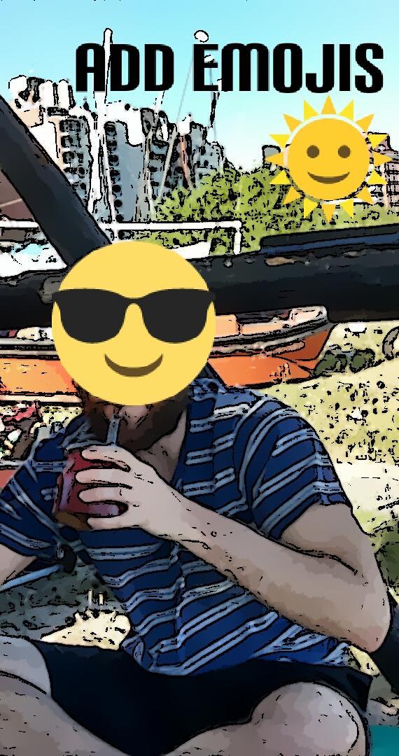 * Emojis: Select the emoji option to open the amazing gallery of over 150 free emoticons to choose from. Add as many emojis as you want. You can move, resize and rotate them.