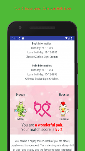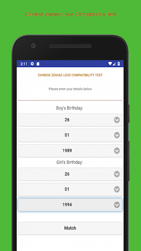 中国の占星術によると、4年間の互いに離れている動物の兆候は互換性があると考えられていますが、6年間であると互換性がありません。電卓はあなたとあなたのパートナー間の互換性をテストすることができます。そして、次の中国の黄道帯の互換性表は、関係を始める前に人々が自分の星座の互換性や愛の互換性を見つけるのを助けるように設計されています。