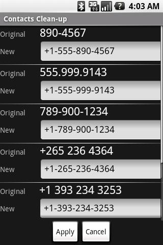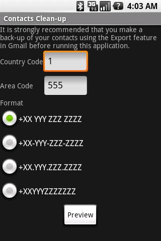 Format phone numbers and Add missing area codesFeatures: Format phone numbers Add missing country codes Add missing area codes Known Issues: Builtin contacts synchronization is not perfect and changing many contacts at once may lead to duplicate contacts or phone numbersLicense and source code available at:http:code.google.compandroidcontactscleanup
