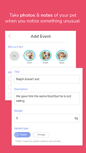 あなたのアプリはあなたのツールです。あなたの獣医と簡単に共有するために、何か異常な起こり、写真を撮るときにそれを書くために使ってください!
