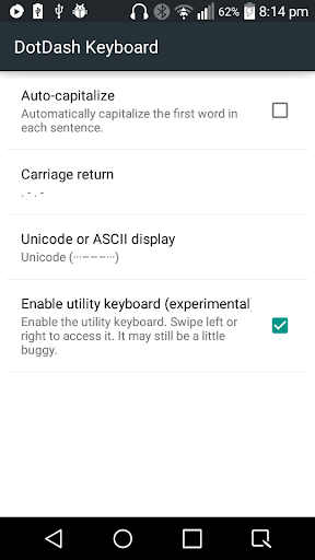 (IMPORTANT: This is an "Input Method", also known as a "soft keyboard" or IME. It acts as a replacement for the default Android on-screen keyboard. As such, it doesn't show up in your applications list. Instead, after installing it you will need to go to your phone's "Language & keyboard" settings screen and tick the checkbox next to "DotDash Keyboard" to activate it. Then, (if you're using Android 3 or later) when you use any text field you will see a keyboard icon in your notifications bar. Tap on that and select "Choose input method" from your notifications list.)