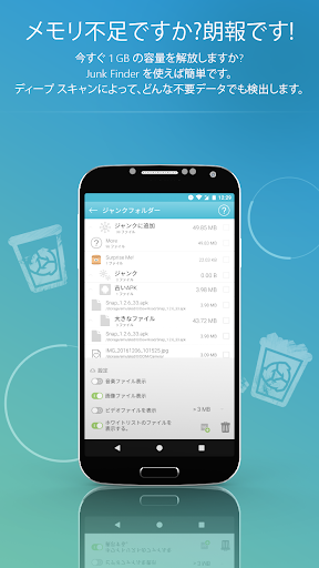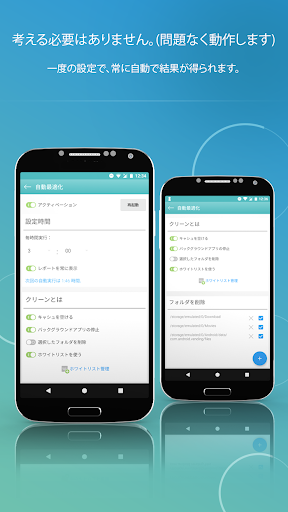 インストールしたアプリ、ダウンロードしたファイル、写真、音楽、ビデオなどでスマートフォンはあっという間に情報が散乱し、処理が明らかに遅くなります。Ashampoo Droid Optimizer は、スマートフォン内の情報の散乱を防ぎ、空き容量の確保やパフォーマンスを向上させます。これを、定期的に自動で行ないます。常に新しいフォルダーを削除する必要がありますか?1-Touch Speed Up と自動クリーンアップに、フォルダーを追加するだけです。この機能は、Junk Finder によってもサポートされています!