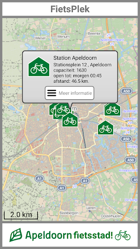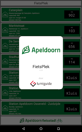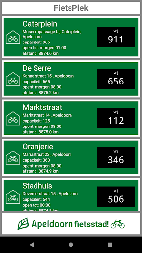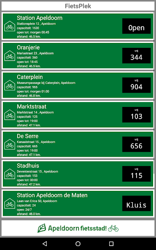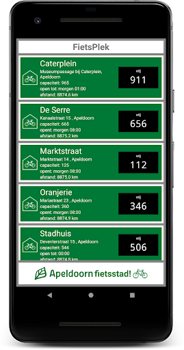 Deze app laat je zien welke fietsenstallingen er zijn in de gemeente Apeldoorn, waar ze zijn en hoe je er komt. Je ziet precies hoeveel plaats in elke fietsenstalling beschikbaar is.