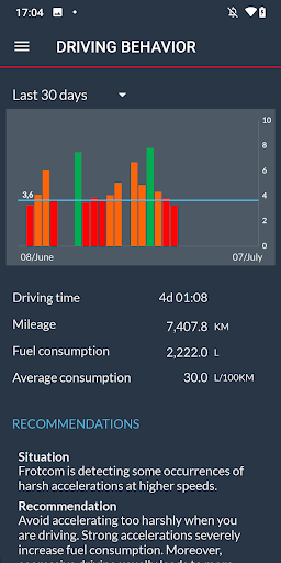 毎日、Frotcomは会社の車両を追跡します。ドライバーアプリは、あなたが行った各旅行に関する情報を表示し、運転行動を獲得します。あなたは、オフィスで見られるものとまったく同じ情報、あなたがどのパスをとったか、旅行による走行距離旅行、燃料消費、運転スコアなどを持っています。