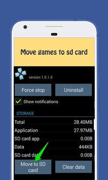 This application Games To SD Card is a one click fast solution to move your Games and your Files from internal memory to SD card in your phone. Move your photos, videos and other downloads to your SD card.