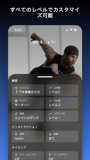 下半身強化の日、心拍数アップ、全身(ジャンプ無し)、または私たちのお気に入りのセクシーな背中などの初期設定から選択するか、有酸素運動、コア、大臀筋、脚、上半身でご自分のミックスを作成します