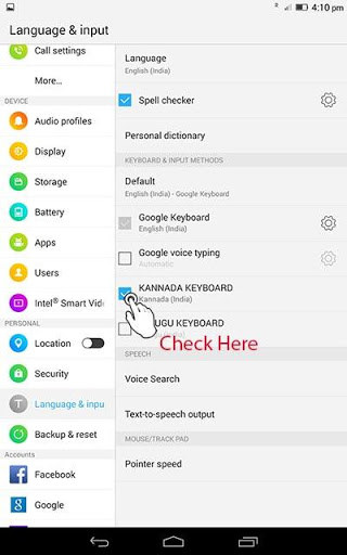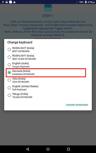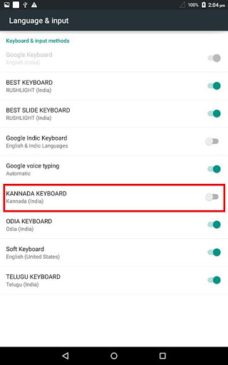 2。 「設定」 - >「言語&入力」 - >現在のキーボード - >キーボードを選択してkannadakeyboardを有効にする - >「Kannadaキーボード」を確認してください。