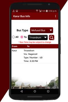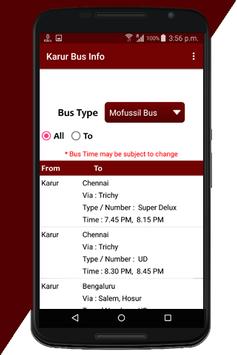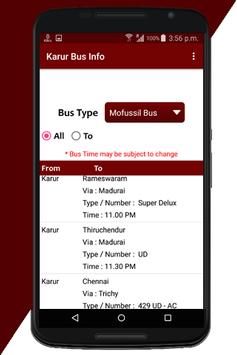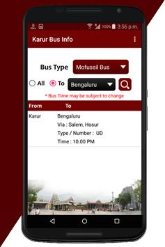 This app provide all information about Karur Mofussil bus and Town bus.