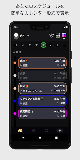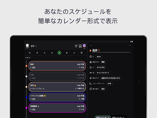 -スケジュール:照明の調光,色の変更,オン/オフの切り替えを自動化しましょう。すべて簡単なカレンダー形式で表示されます。