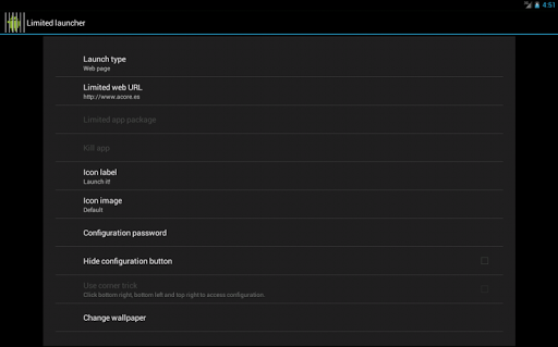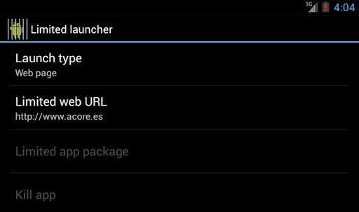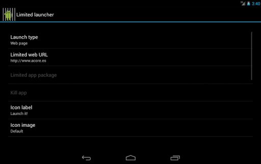 Limited Launcher is a launcher (or Android desktop) focued on executing applications or web pages in kiosk mode, that is, in full screen and without giving the user the chance to exit the app