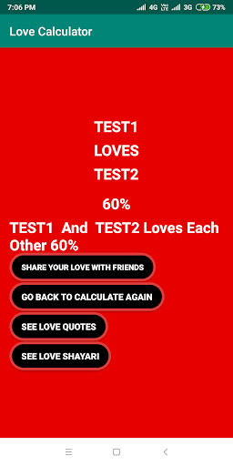 Love calculator app is totally free and will give you best & true result. If you are confused that your partner love you or not OR if you want to know some random persons love feeling about you then you can use this app.
