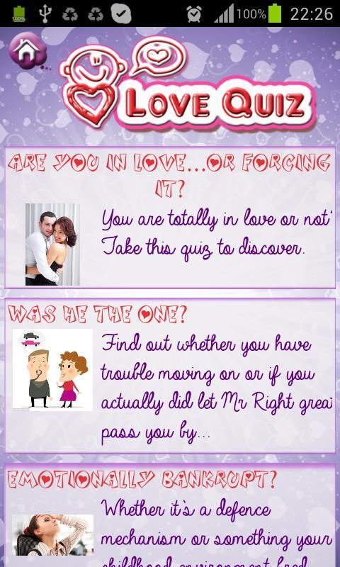 ♥ ღ Love Quizzes (Love Tester): Interesting love quizzes (love tester) will help you find out the true nature, answer what is love, and assess the quality of your relationship. Sample quizzes: Was he the one, Am I hurting him, Are you ready to date, Is your relationship healthy…