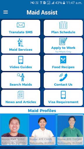 メイドアシストは、国内の雇用主が彼らのメイド(海外国内労働者)とのコミュニケーションギャップを橋渡しするのを助けるように設計されています。翻訳ツールにより、雇用主は自分のメッセージを新しいインドネシアのMaids、Myanmar Maids、Indian Maids、カンボジアのメイド、およびフィリピンのメイドに伝え、SMSを通じて彼らのメッセージを翻訳して送信することを可能にします。