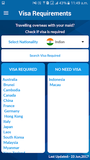 あなたがあなたのメイドを海外に持ってくることを探しているなら、あなたはあなたのメイドのために訪問するつもりの国のビザ要件をチェックするためにこのアプリを使うこともできます。