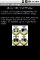 Minecraft Clock Widget is a widget to show the current time with the Minecraft Clock design and system. Instructions: From your home screen, press menu, then add. Select 'Widget', then select 'Minecraft Clock Widget'. The clock will appear on your home screen. Recent changes: Very sorry for the last update; which displayed a stretched clock. Now it's fixed. ... and now, centered vertically and horizontally. I think everything is allright now ;)