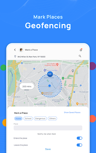 •Geofencing:locationsの周りにGPSジオフェンスを作成し、子供が自宅、学校、またはマークされたものを去ったり到着したりしたときにアラートを取得します場所。