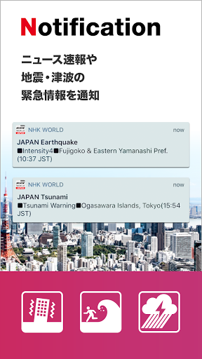 - プッシュ通知で地震・津波の緊急情報をお知らせ(英語・中国語対応)