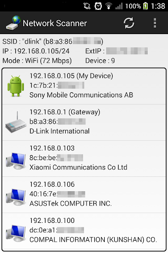 - Start auto scan network and fast display result. - Display WiFi gateway IP, External IP, SSID, MAC, speed infomation. - Display device IP, MAC, vender infomation.