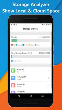 Storage analyzer & disk Usage displays information on sdcard, usb devices, sd-cards, external and internal storage (Google Drive) in a simple and clear graphical form. Storage Analyzer helps to free up disk space and clean file trash by quickly finding and deleting big. It can show you how many app, picture, audio and video in your phone, and how many storages they used.