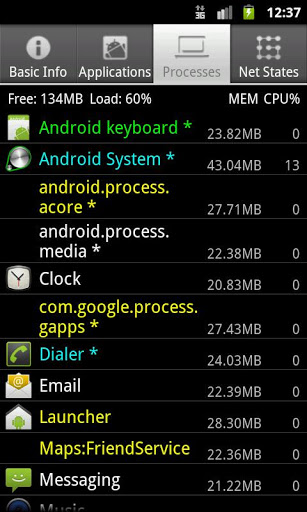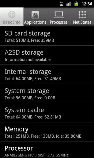 CPU、メモリー、SDカード、実行中プロセス、ネットワーク状態やインストールされたアプリなどの情報やAndroidデバイスの基本システム情報へのクイックアクセス。