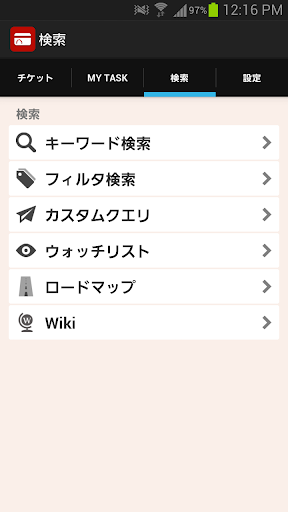 キーワード検索、チケットID検索、ウォッチリスト、カスタムクエリ、ロードマップ等、Redmine for Web と同様のさまざまな検索ができます。