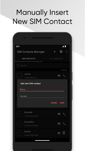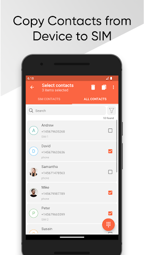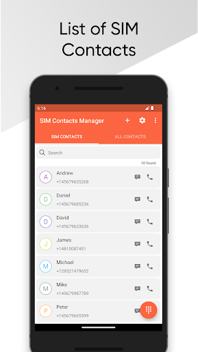 アプリにはSIM連絡先のリストが含まれており、コール、SMS、編集、削除、デバイスへのコピーなどのアクションを実行できます。