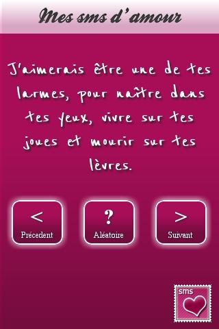 Want to impress your love? Send him or her french romantic sms from this application More than 1000 original, romantic, and poetic sms are waiting for you on Sms d'Amour. A must for all Romeo and Juliet. The database of SMS is regularly updated.content rating: Everyone