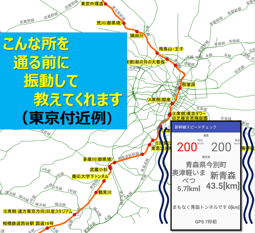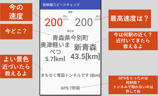 このアプリは、どこを走っているか、走行速度、最高速度、駅を通過したときの速度、近くの駅までの距離、窓から見える気になる景色についても、教えてくれます。「いつ新関門トンネルに入るのかなあ」などの疑問に答えてくれます。