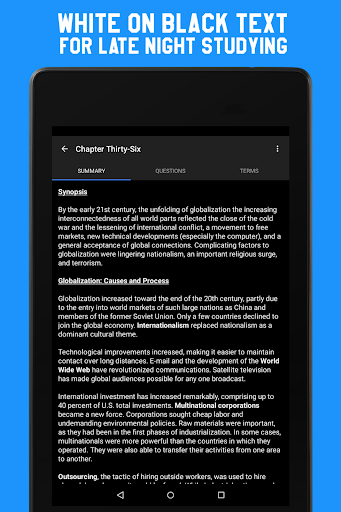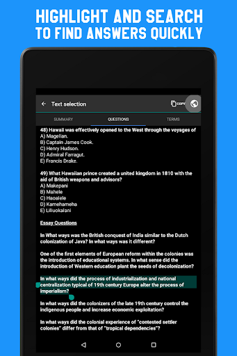 Need to practice before a tough quiz? Each chapter can come with more than 50 actual quiz questions to test your knowledge. If you can't remember the answers to the multiple-choice questions, just select the question and tap the Earth icon at the top to automatically Google the answer!