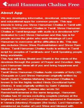 Tamil Hanuman Chalisa Audio Free App is an exclusive Tamil language Hanuman Chalisa app for Tamilnadu and Tamil speaking people. This app also includes Shree Shiva Rudrashtakam and Shree Ram Stutee. This app intends to bring you Shree Hanuman Chalisa in Tamil with reading Shri Hanuman Chalisa in Tamil.