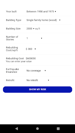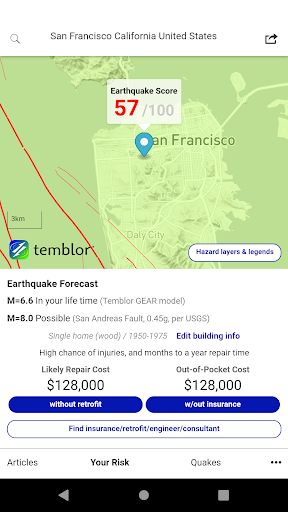 あなたの家の年齢とサイズを入力することによって、Temblorは地震の損傷の可能性と直感的なインタラクティブな円グラフの修理の費用を推定します。 Temblorはまたあなたの家へのボルトとブレースの後付けの費用と安全上の利益を推定するので、あなたはこれがあなたにとって理にかなっているかどうかを評価することができます。さらに、Temblorはあなたの場所であなたの家のための典型的な地震保険政策のための支払いの可能性を推定します。